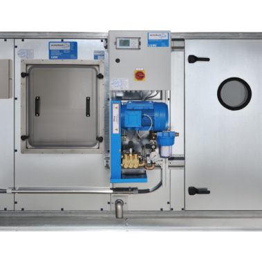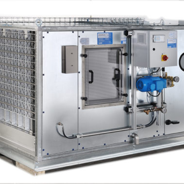 Bei der Befeuchtung über einen Zuluftkanal wird zunächst Stadtwasser in einer Wasseraufbereitungsanlage demineralisiert. Im Ergebnis entsteht völlig kalk- und salzfreies Wasser, welches nun zur Verdunstung bzw. Luftbefeuchtung eingesetzt werden kann. Das Befeuchtungswasser wird in einer drehzahlgeregelten Industrie-Hochdruckpumpe auf Drücke, die zwischen 40 und 120 bar liegen, gebracht. Somit lassen sich alle gewünschten Feuchtewerte der Zuluft und der Raumluft auf +/- 2 Prozent relative Feuchte ausregeln. Eine Hochdruckleitung führt das Druckwasser zu speziellen Feinstnebeldüsen, die in Luftrichtung des Zuluftstroms angeordnet sind. Ein Düsenstock aus Edelstahl, welcher ganzflächig über den Querschnitt des Zuluftkanals verteilt ist, sorgt für eine absolut homogene Luftbefeuchtung der Zuluft und letztlich des Raumklimas.